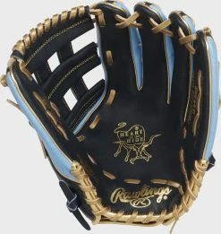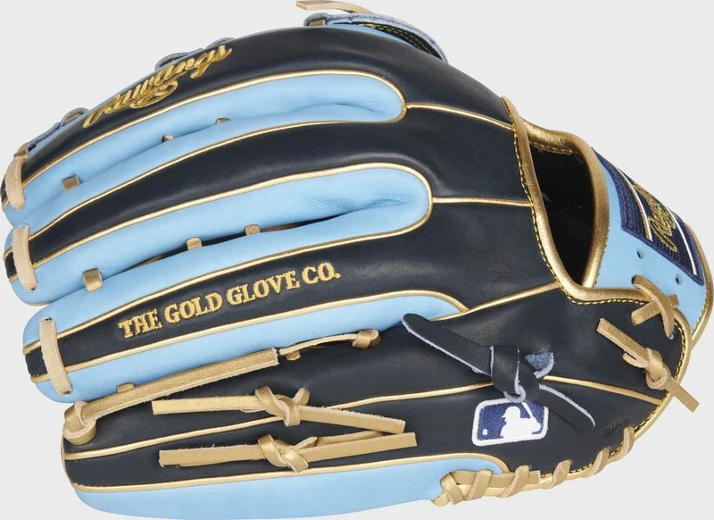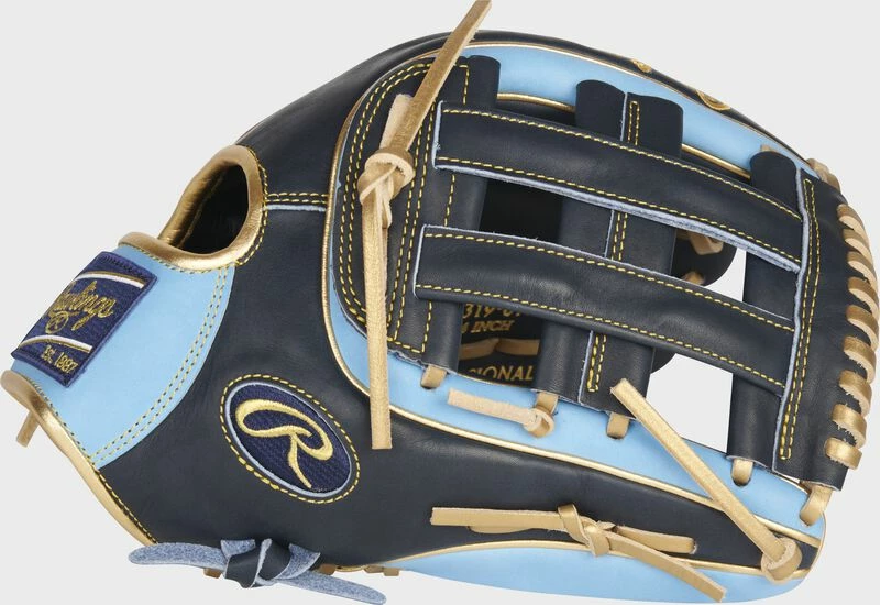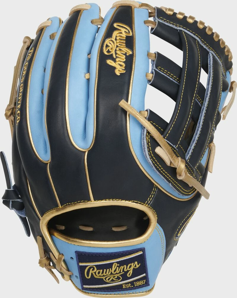 In addition, this outfield glove features the same pro qualities you expect from any Heart of the Hide model. This includes a steer hide leather lining, a padded thumb sleeve, and a thermoformed wrist strap for superior comfort and feel. This particular HOH R2G glove also features a redesigned heel pad to promote an easier close. Constructed in our unique 331-pattern, which features a double-welt design, this gamer plays like our traditional 303-outfield pattern. A pattern made popular thanks to it’s deep, round pocket. Add in its pro H-web and you have an outfield glove made for players who want to excel now. All this was packed into an ultra-stylish navy and Columbia blue design, with gold lace accents that are sure to make you the talk of your team!