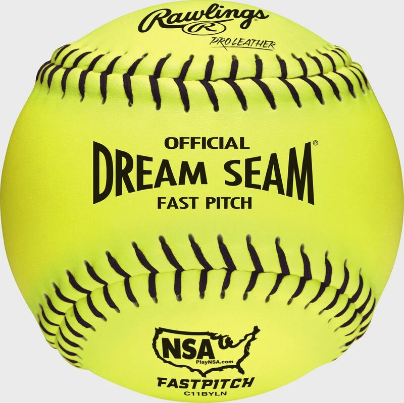 The Official 11″ NSA fastpitch softballs have black stitching and are approved for play in the NSA. These Dream Seam softballs have a raised seam with a high density cork and Pro Leather cover.